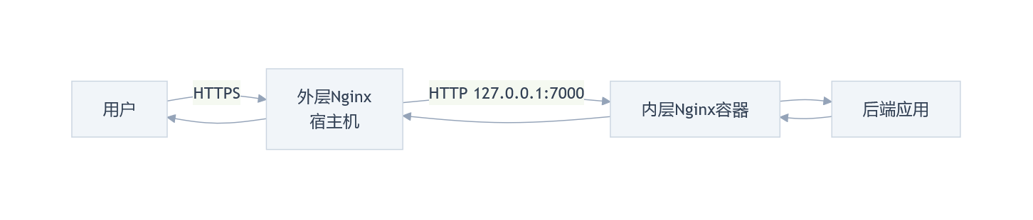 This article demonstrates the setup on a single host machine: the outer Nginx is installed directly, while the inner Nginx runs in a Docker container, verifying the collaborative logic of the two layers.