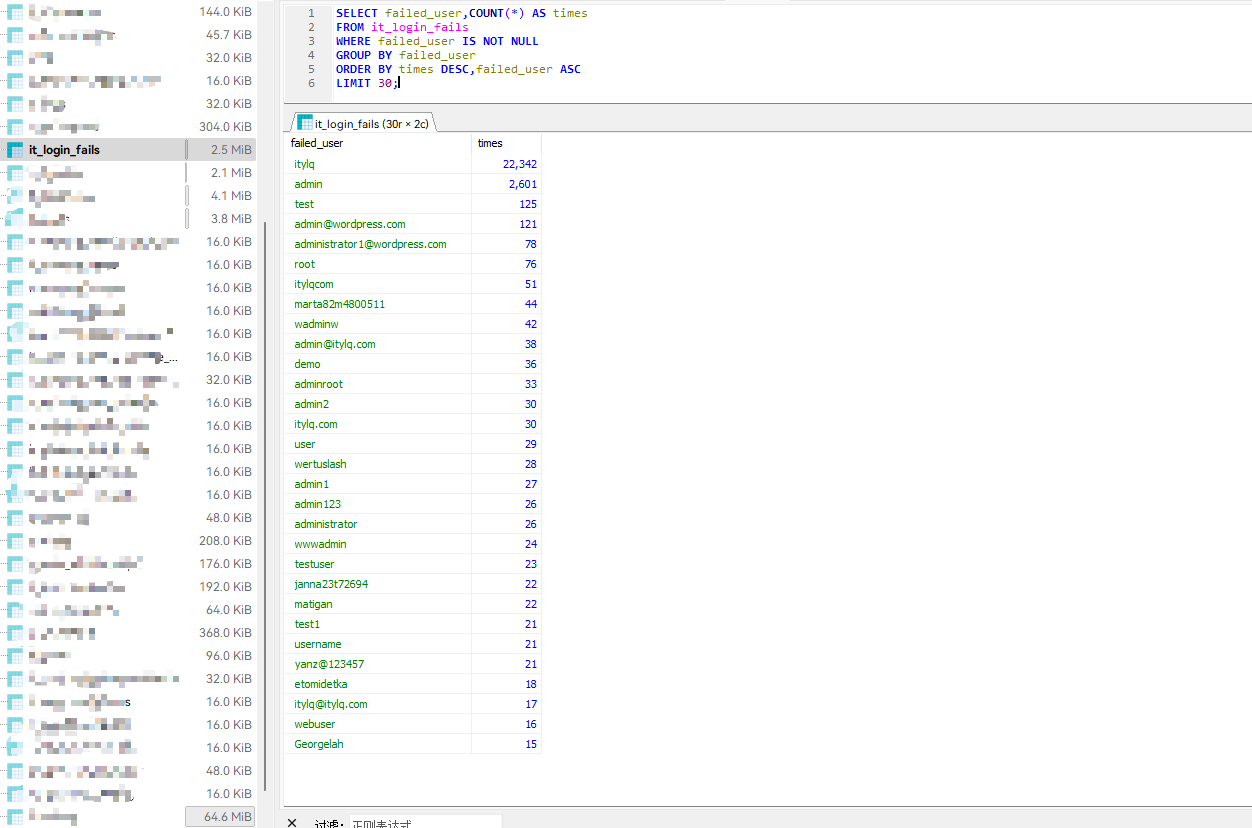 Fortunately, the interception records of Login Lockdown are stored directly in the MySQL database, which makes data analysis simpler and faster. Pick up the half-baked MySQL query command and simply query: