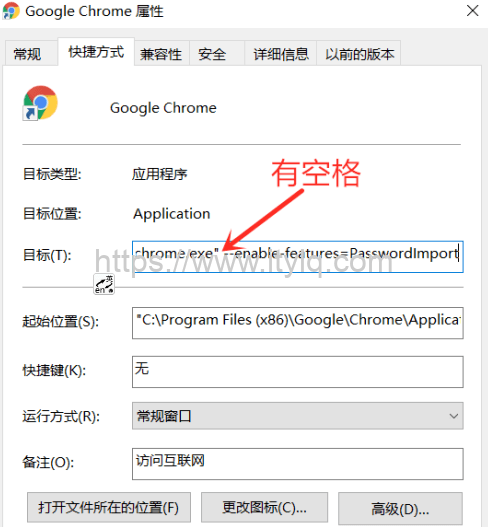 The second method is to find the shortcut icon of Google Chrome on the system desktop, right-click, "Properties", "Target (T)" after the existing string, enter "space" and "--enable-features=passwordimport", confirm and save. Then double-click the shortcut to open Google Chrome, enter the management interface through "Settings" -> "Autofill" -> "Password Manager", click the 3 dots on the right, and find that the "Import Password" button option also appears.