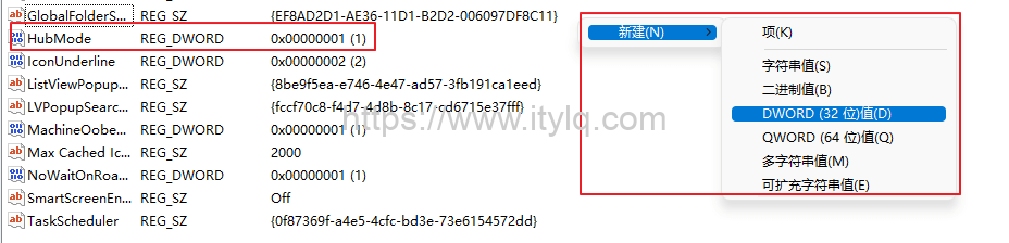 - Expand "Computer\HKEY_LOCAL_MACHINE\SOFTWARE\Microsoft\Windows\CurrentVersion\Explorer" in turn, then right-click to create a new "DWORD (32-bit) value D", change the name to "HubMode", the value is "1": //Value 1, hide quick access; value 0, show quick access