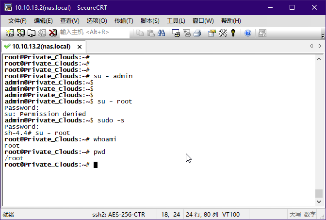 通过提示符前缀、whoami 和 pwd 命令可以进一步确定已经成功切换到 root 用户,当前用户就是 root 用户。
