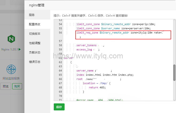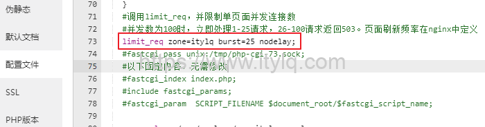 我目前想要的是对www.itylq.com全站页面的访问频率做一下限制,所以只需要在itylq.com网站的server{}域内调用即可。