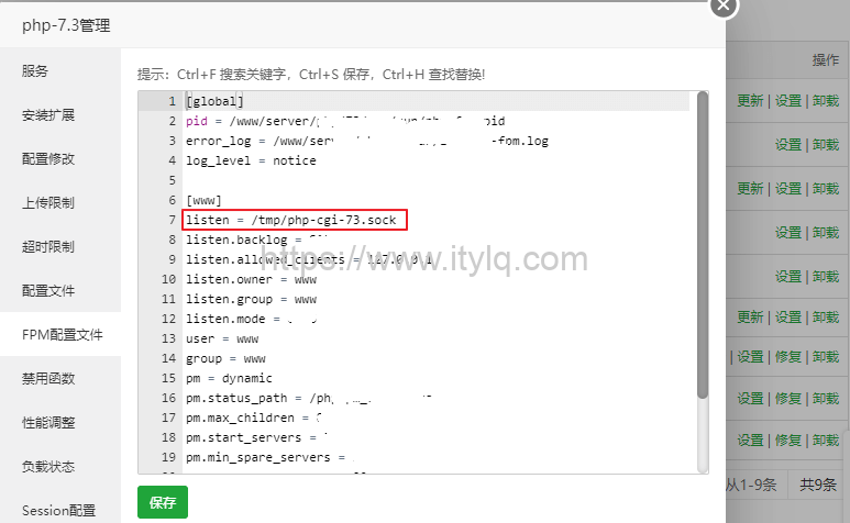 相较于server{}域内调用limit_req,location{}内调用除了limit_req命令外,还需要指定fastcgi_pass路径,另外3行命令无需修改直接复制即可。fastcgi_pass路径可以通过php查询。比如网站使用的是php7.3,则可以通过宝塔面板->软件商店->已安装,找到对应的php,查看FPM配置文件,找到listen字段值复制即可。